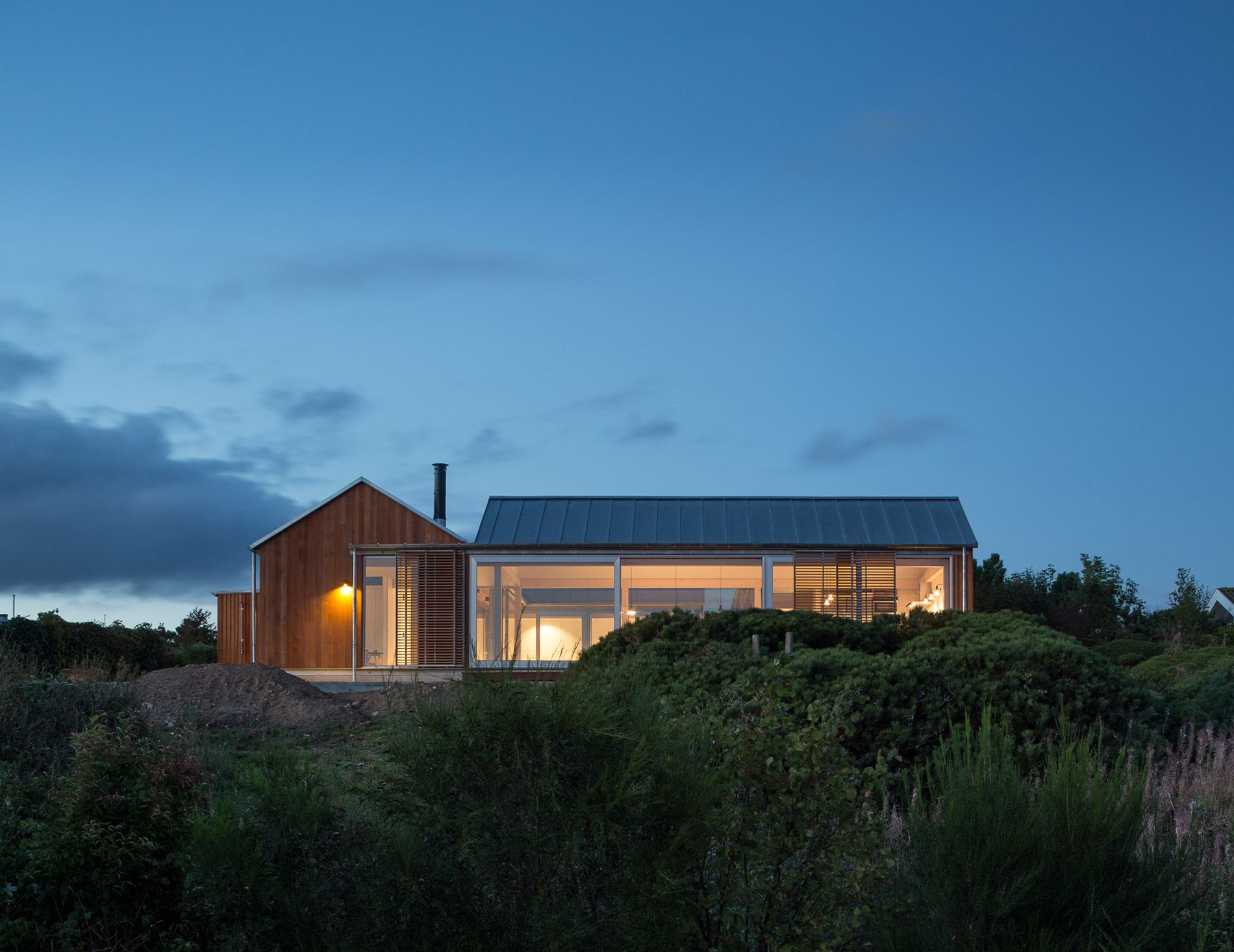 The outer façade alternates between planes of oiled cedar boards, sliding shutters with horizontal cedar slats, and aluminum-framed floor to ceiling windows. Sheltered from the strong coastal winds lies the inner courtyard, framed by four glazed façades with large format windows, hinged doors and the sliding doors which allow for an elimination of the physical boundaries between interior and exterior space.