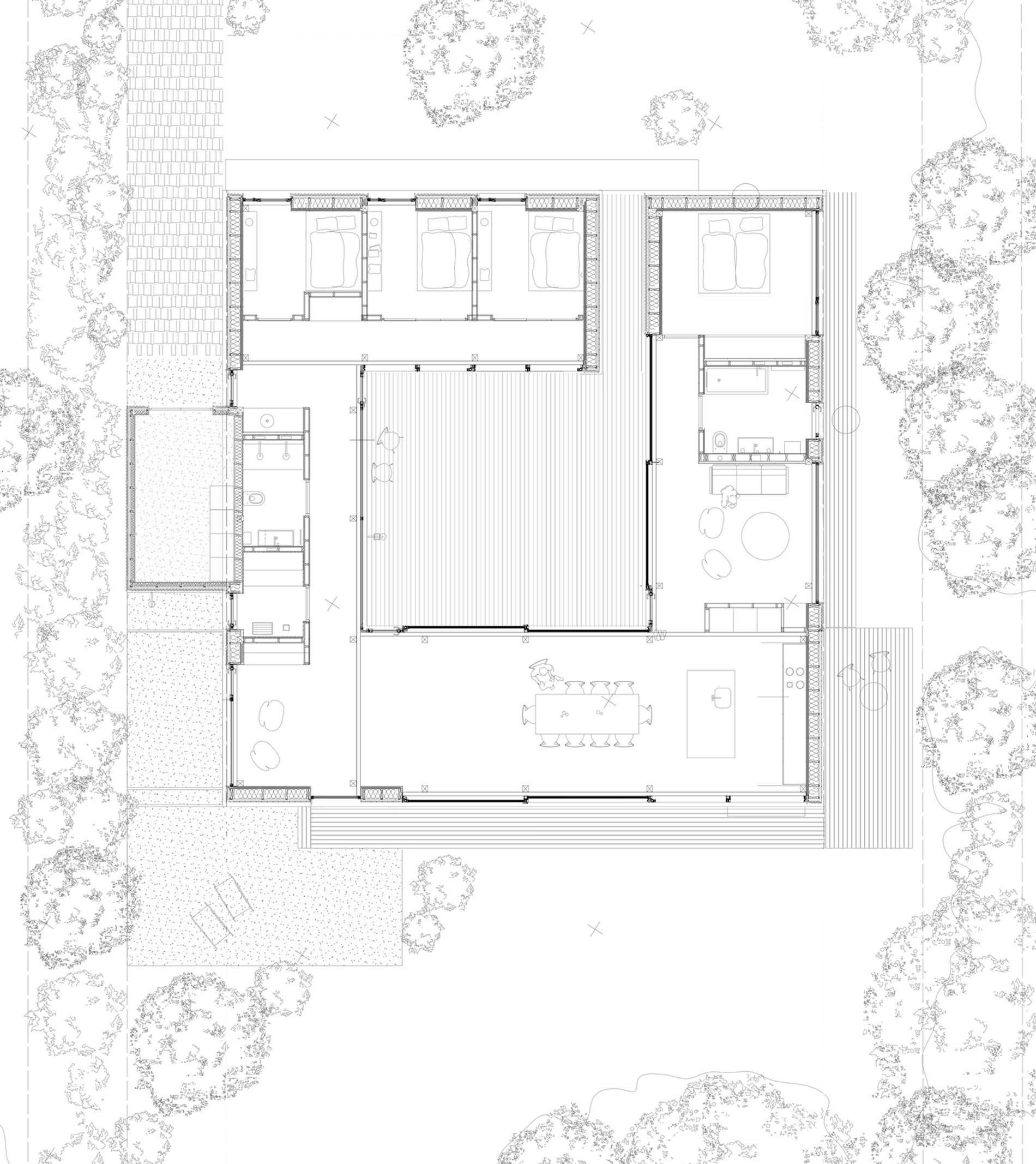 Each of the four units serve different functions: one contains the entrance area, another accommodates guest rooms, the southern forms a space for living, dining, and cooking while the final one provides an adjacent living space as well as the master bedroom.